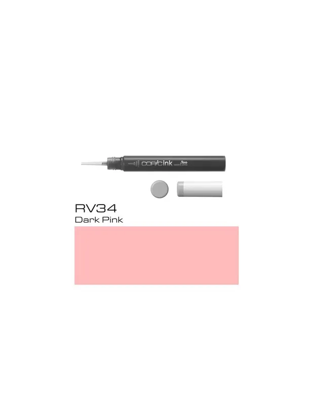 COPIC INK TYP 12ml RV34La gama de tinta copic base alcohol Copic Ink 12 ml esta compuesta por 358 colores para rellenar todos tus rotuladores Ciao, Marker, Sketch y Wide, consiguiendo un ahorro de precio muy importante. Con cada botella de 12 ml podrás rellenar hasta 9 veces el Copic Ciao, 7 veces el Copic Sketch y 5 veces el Copic Marker (Classic).Las tintas se pueden mezclar entre ellas para crear tus colores personalizados usando una botella vacía o un rotulador vacío.Estas tintas substituyen a las antiguas «Copia Various Ink: tienen el mismo tipo pero ahora con nuevo y mejor envase:Este envase mejorado en forma de bolígrafo es más compacto y fácil de transportar en los estuches. La botella es transparente y cuenta con marcas de graduación para leer con facilidad la cantidad de tinta que se usa. Además el color y la forma del tapón ayudan a identificar el color aplicado. Su boquilla cuenta gotas es larga y precisa, lo que permite recargar los rotuladores de manera limpia, suave y rápida, así como realizar creaciones de alcohol ink pouring art».Para el relleno de los rotuladores:1) Destapar las dos puntas 2) Extraer 1 punta del rotulador (con la mano o con la ayuda de las pinzas) 3) Colocar la boquilla de la botella COPIC INK dentro del rotulador sin punta. 4) Presionar la botella COPIC INK, hasta llenarlo. Se puede ver porque la otra punta se ve mojada y del color» u observando las unas marcas de graduación. La cantidad de tinta para rellenar (1 vez): Ciao: 1,4 ml aprox. / Sketch: 1,8 ml aprox. / Marker (Classic): 2.5 ml aprox. / Wide : 3,4 ml aprox. 5) Colocar la punta otra vez, dibujar unas rallas de prueba y taponar