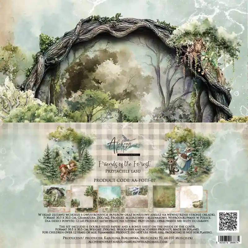 Alchemy of Art Kit de Papeles 30×30 – Amigos del Bosque6 papeles de doble cara, 12 diseños diferentes y una hoja de bonus extra.Diseñado por Karolina Bukowska.Gramaje: 250 gr.Libres de ácido y ligninas.Impreso en Polonia.