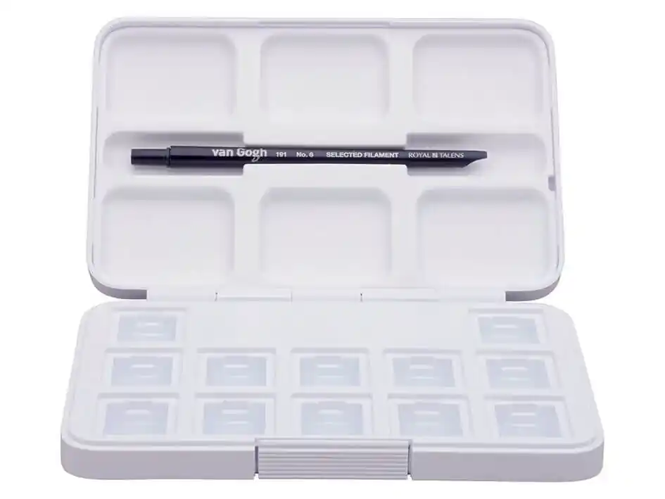 Caja de bolsillo de acuarela para 12 medios godets.Incluye un pincel desmontable nº 4 de pelo sintético.