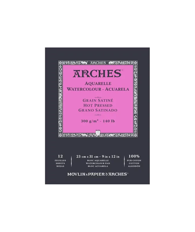 Bloc para acuarela de la marca Arches encolado en el lado corto, una nueva presentación que permite disfrutar de la misma calidad de siempre a un precio muy asequible.El considerado por muchos acuarelistas y artistas de todo el mundo uno de los mejores papeles de acuarelaTamaño: A4 (21 x 29,7 cms.)Hojas : bloc de 12 hojasGramaje: 300 grs.y grano satinadoAlgodón: 100% algodónOtras características: sin ácido ni blanqueadores ópticos,con tratamiento antifúngico (antimoho),calidad de conservación óptimaTécnicas: acuarela y técnicas de agua ( tinta,acrílico,témpera,gouache…)