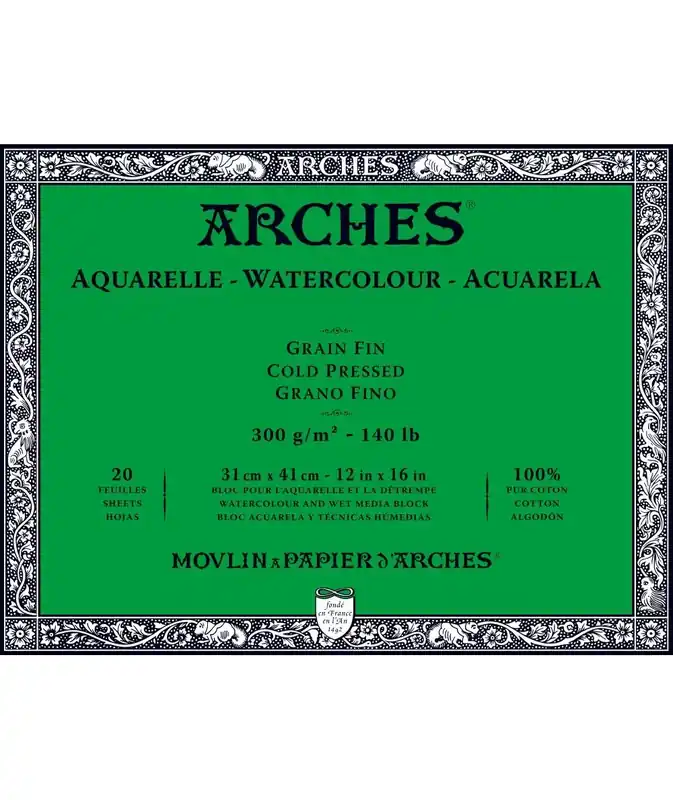 Bloc para acuarela de la marca Arches encolado en los cuatro lados,el bloc clásico de Arches para pintar directamente sin tener que fijar el papel a un tableroConsiderado por muchos acuarelistas y artistas de todo el mundo uno de los mejores papeles de acuarelaTamaño: 31 X 41 cms.Hojas : bloc de 20 hojasGramaje: 300 grs.y grano finoAlgodón: 100% algodónOtras características: sin ácido ni blanqueadores ópticos,con reserva alcalina y con tratamiento antifúngico (antimoho),calidad de conservación óptima.Técnicas: acuarela y técnicas de agua ( tinta,témpera,acrílico,gouache…)