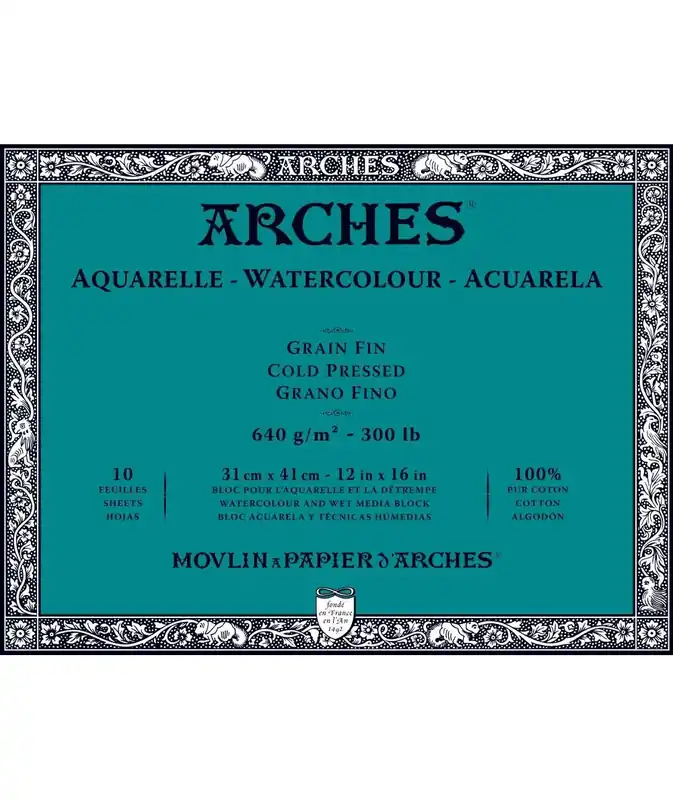Bloc para acuarela de la marca Arches encolado en los cuatro lados,el bloc clásico de Arches para pintar directamente sin tener que fijar el papel a un tableroConsiderado por muchos acuarelistas y artistas de todo el mundo uno de los mejores papeles de acuarelaAlto gramaje lo que lo convierte en prácticamente un cartónTamaño: 31 X 41 cms.Hojas : bloc de 10 hojasGramaje: 640 grs.y grano finoAlgodón: 100% algodónOtras características: sin ácido ni blanqueadores ópticos,con reserva alcalina y con tratamiento antifúngico (antimoho),calidad de conservación óptima.Técnicas: acuarela y técnicas de agua ( tinta,témpera,acrílico,gouache…)