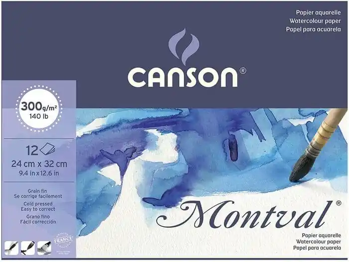 Bloc para acuarela Canson Montval 24×32 cm.Grano fino.300 gr/m212 hojasPapel de acuarela de color blanco natural, apropiado para acuarela y otras técnicas humeda como gouache o acrílico. Papel de estudio para acuarela sin ácido ni blanqueadores ópticos. Con tratamiento antifungico, lo que ofrece una longevidad excelente a nuestros trabajos. Gracias a su capacidad para hacer retoques se puede corregir mediante raspado, sin levantar pelusas.