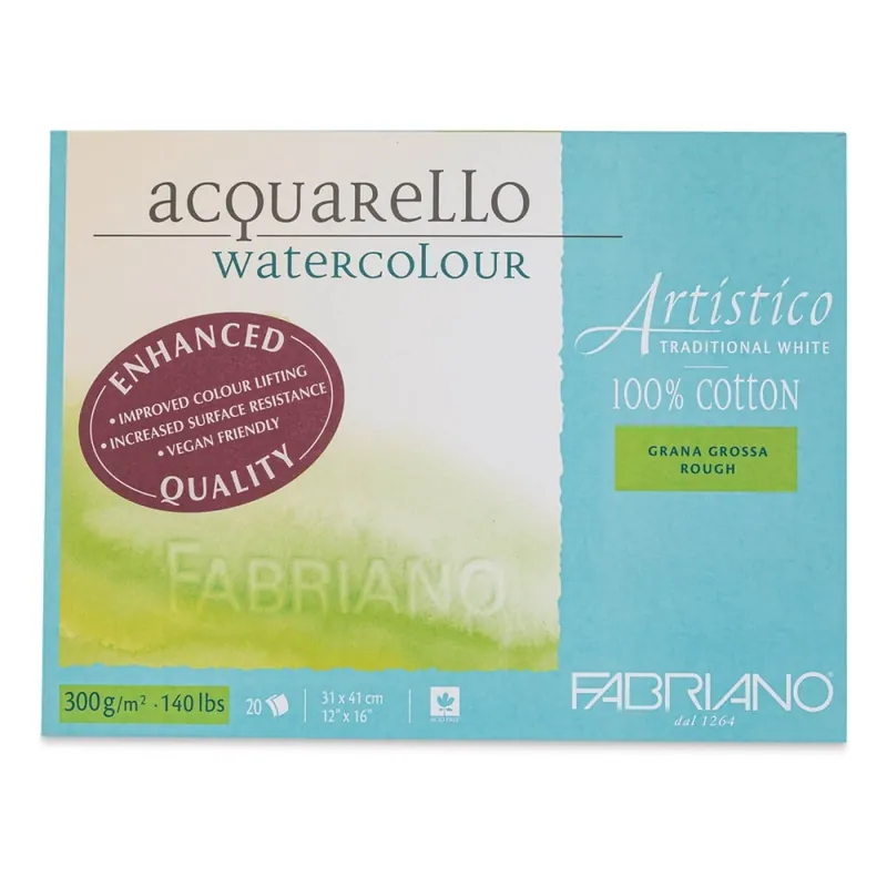 Bloc Fabriano Artistico para acuarela de grano grueso, 300 gr/m2, 31×41 cm. y 20 hojas.El papel &lArtistico&r representa la culminación de ocho siglos de tradición papelera de Fabriano.Artistico es un papel para acuarela fabricado con un 100% de fibras de algodón hecho en máquina de forma redonda un proceso industrial especial que reproduce las características típicas del papel hecho a mano, por lo que también se llama «mano macchina».En la actualidad, Fabriano refuerza el valor de su papel &lArtistico&r mediante una calidad superior y una presentación acorde con su reputación. Estos son los aspectos más destacados de este papel: encolaje de la superficie mejorado , superficie más resistente, 4 lados con barbas, marca de agua de punto fijo y producto Vegan Friendly.