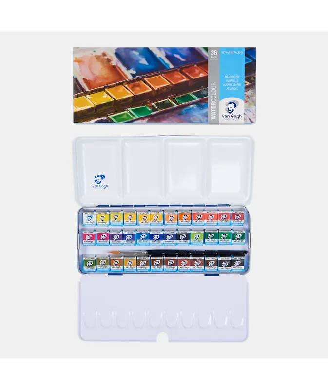Estuche metálico de acuarelas de la marca Van Gogh,la línea media de calidad de la marca TalensContiene 38 pastillas de acuarela tipo medio godet y un pincel de pelo sintético redondo número 6Recambios de los colores sueltos disponibles.
