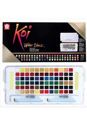 Estuche de acuarelas de la marca japonesa Sakura KoiContiene 72 colores de acuarelas vibrantes e intensos presentados en una práctica,cómoda y funcional caja de plástico que incluye:amplia paleta de mezclasdos pinceles vacíos con depósito de agua para llevar en poco espacio un gran surtido de pinturas de acuarela