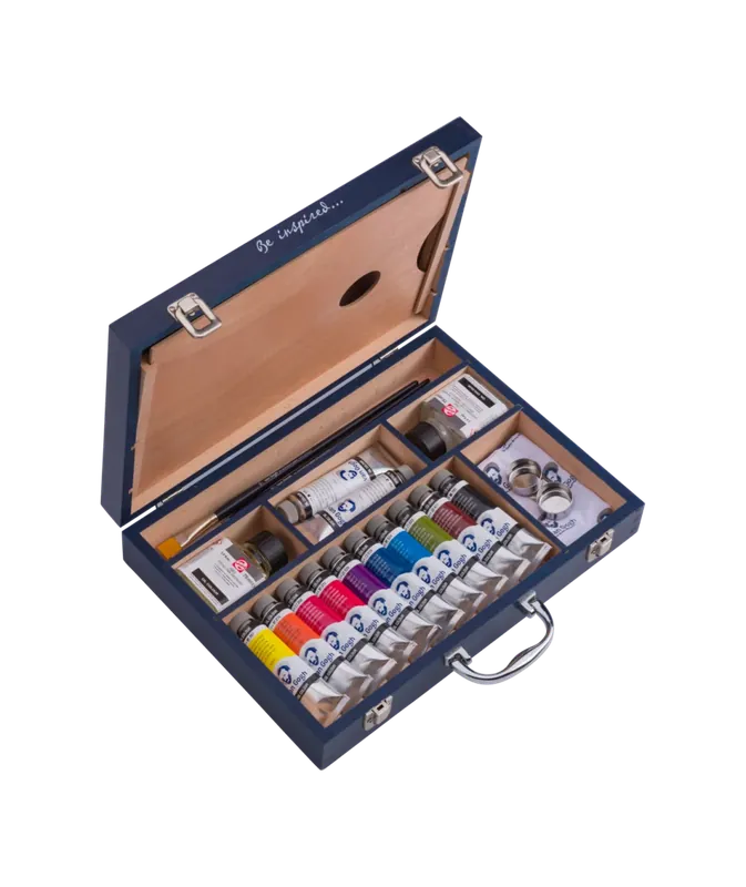 ¡Inicia tu trayectoria como artista con la caja XL para principiantes con pinturas al óleo Van Gogh! Este estuche cuenta con una recopilación completa de materiales de pintura, como una selección de colores populares, pinceles y otros accesorios.En resumidas cuentas: todo lo que necesitas para empezar a trabajar con la pintura al óleo.Contenido: 12 tubos de 40 ml (104 Blanco zinc – 105 Blanco titanio – 267 Amarillo azo limón – 276 Anaranjado azo – 366 Rosa quinacridona- 372 Rojo permanente – 536 Violeta – 570 Azul ftalo – 534 Azul cerúleo – 623 Verde vejiga – 411 Tierra de Siena tostado – 701 Negro marfil), 1 white spirit inodoro de 75 ml, 1 medio de pintura de 75 ml, 2 pinceles, una paleta de madera, un vaso para la paleta, un paño y una guía de mezcla de colores.Pinturas al óleo Van GoghPintura al óleo pastosa con un buen poder coloranteNivel de pigmentación medio alto para colores intensosGrados uniformes de brillo y espesor entre coloresFácil de mezclar y aplicarGrados de resistencia a la luz de buenos a excelentesMagnífica para artistas principiantes, estudiantes en niveles avanzados y profesionales