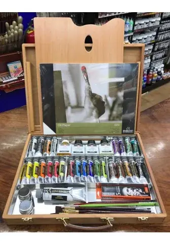 Set de óleos de la marca Rembrandt En caja de madera de haya vaporizada marca Mabef calidad premium con interior forrado de zinc para facilitar la limpieza de la caja y divisiones móviles según las necesidades de cada pintor.Surtido de 25 tubos de óleo calidad profesional Rembrandt en colores surtidos.Blanco titanio de 150 ml.Aceitera doble metálica con tapa.Auxiliares de pintura de 75 ml (white spirit o trementina,medium para óleo y barniz final)PaletaSet de carboncillos NitramSurtido de ocho pinceles para óleo en tamaños surtidosBloc de papel especial para pintura al óleo