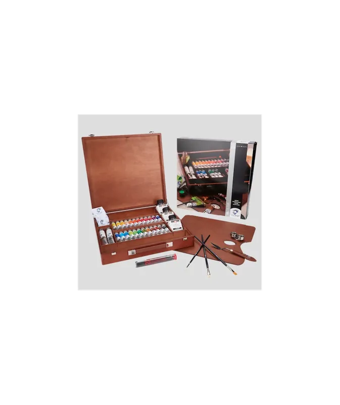 Caja de pintura al óleo de la marca Van Gogh en madera de color haya Lleva en su interior:24 óleos de 20 ml Van Gogh en colores surtidos2 blancos de 60 ml 3 auxiliares de 75 ml 3 pinceles Accesorios: espátula, carboncillos, aceitera doble metálica y paleta de madera con paño de limpieza.