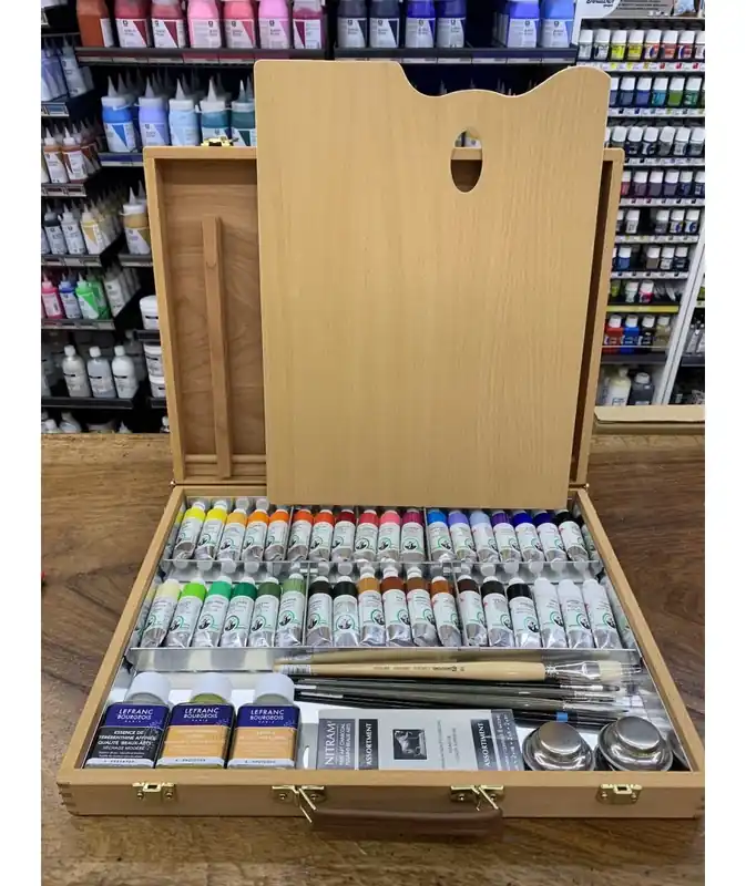 Caja de óleos de la máxima calidad de la marca holandesa Old Holland.Presentados en una caja de madera de haya vaporizada de alta calidad la caja de óleos Old Holland consta de :36 tubos de 40 ml en colores surtidos 3 auxiliares en frascos de 75 ml set de 8 pinceles surtidos para óleo de alta calidadSurtido carboncillos NitramAceitera doble metálicaPaleta para mezclas barnizada.Tamaño de la caja cerrada: 49,5 x 38,5 x 7,5 cms.Son óleos que se fabrican siguiendo las recetas de los viejos maestros holandeses pero con la tecnología más moderna y teniendo en cuenta las opiniones,sugerencias…de artistas actuales en todo el mundo.Con la mayor proporción posible de pigmento en cada color mezclando los mejores colores tradicionales con los pigmentos de mayor resistencia a la luz.Hechos sólo con pigmentos y aceite de linaza prensado en frío de la primera presión.