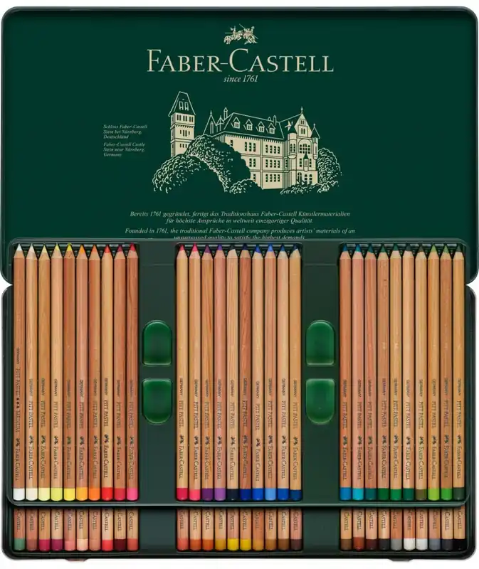 Caja de metal con 60 lápices pastel de la marca Faber Castell,toda la gama completa de lápiz pastel de este fabricanteColores intensos fáciles de difuminar con el dedo,difumino,tela …Mina de 4,3 mm de diámetro altamente resistente a la roturaColores altamente resistentes a la acción de la luz Disponibles recambios sueltos para reponer