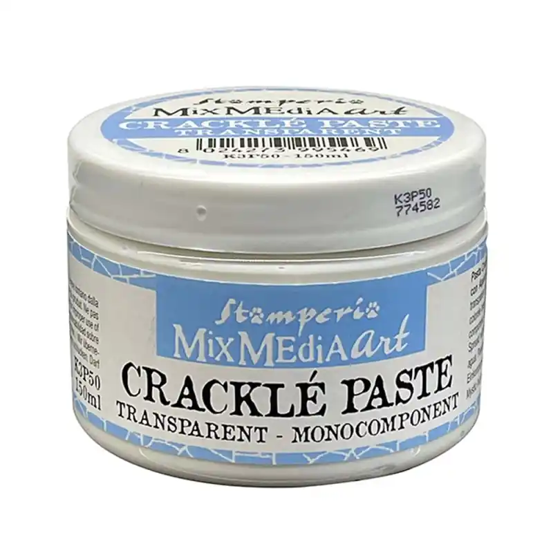 Pasta Craqueladora transparente monocomponente de Stamperia.Pasta de base agua transparente, adecuada para crear una superficie agrietada.El tamaño de las grietas depende del grosor de la pasta aplicada.Las grietas se forman en 6 – 8 horas. Con el secador, se reduce el proceso a 20 minutos.También es adecuado para trabajar con plantillas y es ideal para MIX MEDIA.Después del secado, se vuelve transparente.Es impermeablecontenido 150ml.