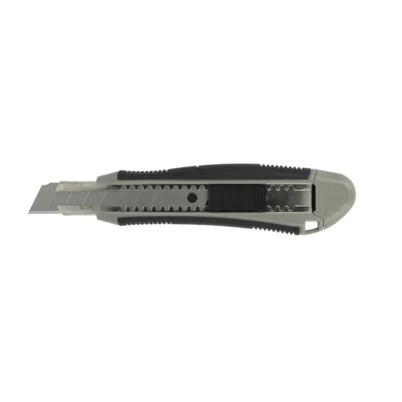 Cutter de corte profesional Westcott.Hoja de 18 mm.Soporte de plástico gris/negro con guía metálica, bloqueo deslizante y mango de agarre suave.Con 2 hojas de recambio.