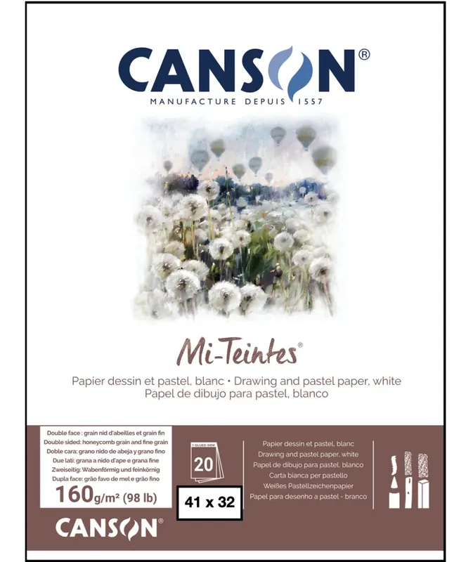 Bloc Canson M-Teintes para pastel y dibujo en color blanco Tamaño: A3 aproximadamente (41 x 32 cms.)Hojas : bloc de 20 hojas ,encolado en el lado cortoGramaje: 160 grs.; grano fino en una cara y grano nido de abeja en la otra,puede usarse por ambas carasColor: hojas blancasTécnicas: técnicas secas como lápiz,carboncillos,pastel,grafito,etc.,también algo de tinta y acuarela ligera así como manualidades (plegado,cortado,creación de tarjetas…).También se puede usar como fondo de dibujos a la hora de enmarcar por su gama de colores neutros y su especial texturaOtras características: es un papel de pulpa teñida que ha ganado un reconocimiento mundial sobre todo en la técnica de pastel.Cumple la normativa ISO 9706 de conservación lo que garantiza una conservación óptima