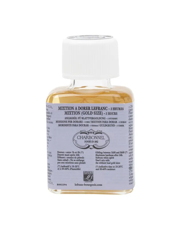 De reputación internacional, sirve tanto para el dorado industrial como para la restauración monumental. Garantiza una longetividad excepcional. LEFRANC BOURGEOIS MIXTION 75ML PARA DORAR 12H SIN PLOMO