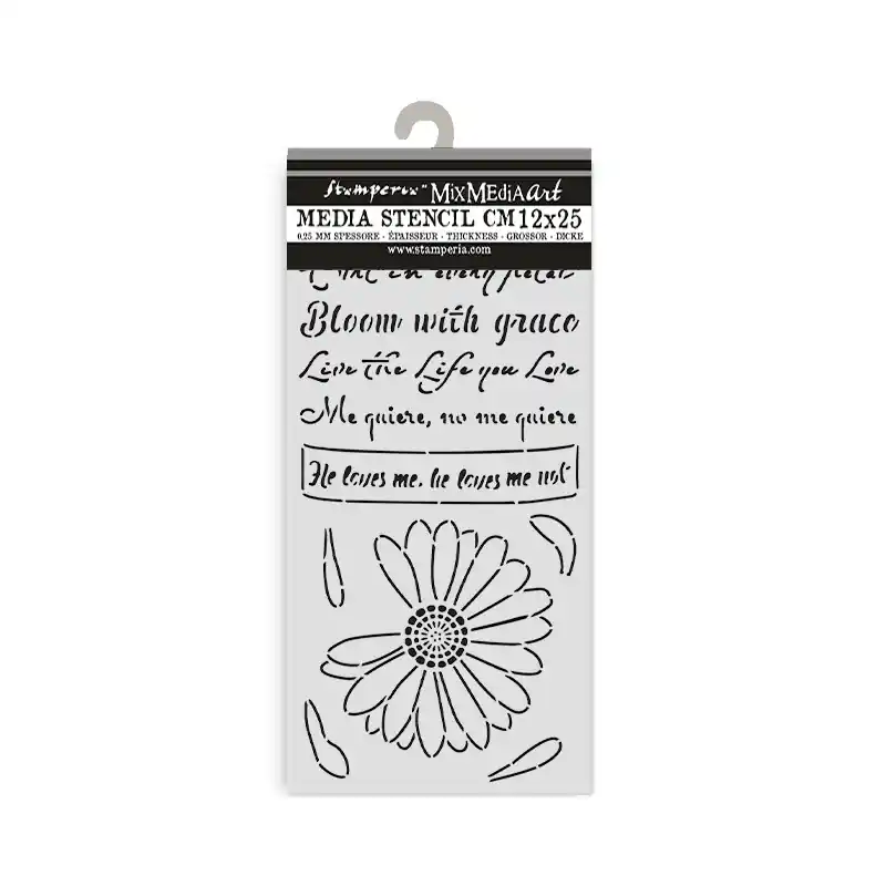 Stencil Stamperia Mix Media Art 25 x 12 cm. – He loves me, he loves me notIdeal para todos los proyectos, especialmente para Mix Media por su grosor de 0.5 mm.Las máscaras son elementos muy versátiles y que dan mucho juego, tanto en el mundo del scrapbooking como en el del Mixed Media. Con ellas puedes hacer un montón de cosas: crearte tus propios fondos, tus propios adornos, texturas… Puedes usarlas con tintas en spray, con tintas Distress y sus aplicadores, estarcido con purpurina, pigmentos o Perfect Pearls, aplicarles gesso o pasta de relieve… ¡Cuando empieces a cogerles el gusto no sabrás vivir sin ellas!