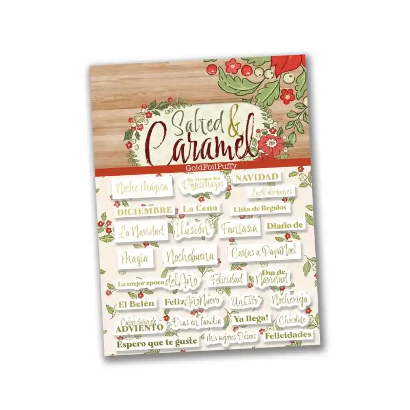 Pegatinas adhesivas acolchadas – Colección Salted & Caramel by Alberto JuárezSet de 29 palabras y frases con acabado en foil dorado vintage. Pegatinas acolchadas de alta calidad, ideales para decorar álbumes, tarjetas y proyectos creativos.