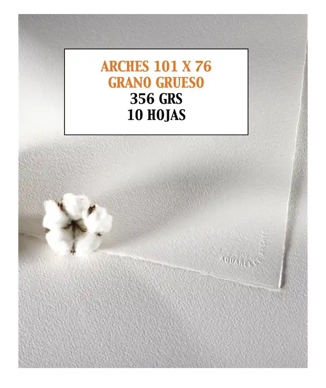 Papel para acuarela de la marca Arches,el que es considerado por muchos artistas el mejor papel de acuarelaTamaño: 101,6 x 64,8 cmsCantidad hojas: 10 hojas Gramaje: 356 grs.y 100% algodónGrano: GRUESOCaracterísticas: libre de ácidos y con tratamiento antifúngicoTécnicas: el papel por excelencia para acuarela.Válido para témpera,gouache,acrílico,tintas y técnicas de agua en general.Color: blanco naturalCararacterísticas:Absorbe mucha agua sin deformarse y sin modificar los coloresAcepta los raspados y retoquesAdmite las superposiciones de aguada y correcciones sucesivasImpide que los pigmentos penetren en el centro del papelDa brillo y transparencia a los coloresPresenta una blancura natural muy duraderaGarantiza una perfecta conservación con el paso del tiempo