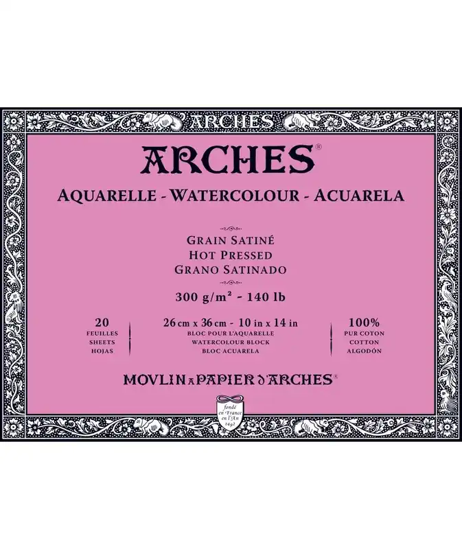 Bloc para acuarela de la marca Arches encolado en los cuatro lados,el bloc clásico de Arches para pintar directamente sin tener que fijar el papel a un tableroConsiderado por muchos acuarelistas y artistas de todo el mundo uno de los mejores papeles de acuarelaTamaño: 26 X 36 cms.Hojas : bloc de 20 hojasGramaje: 300 grs.y grano satinado (liso)Algodón: 100% algodónOtras características: sin ácido ni blanqueadores ópticos,con reserva alcalina y con tratamiento antifúngico (antimoho),calidad de conservación óptima.Técnicas: acuarela y técnicas de agua ( tinta,témpera,acrílico,gouache…)