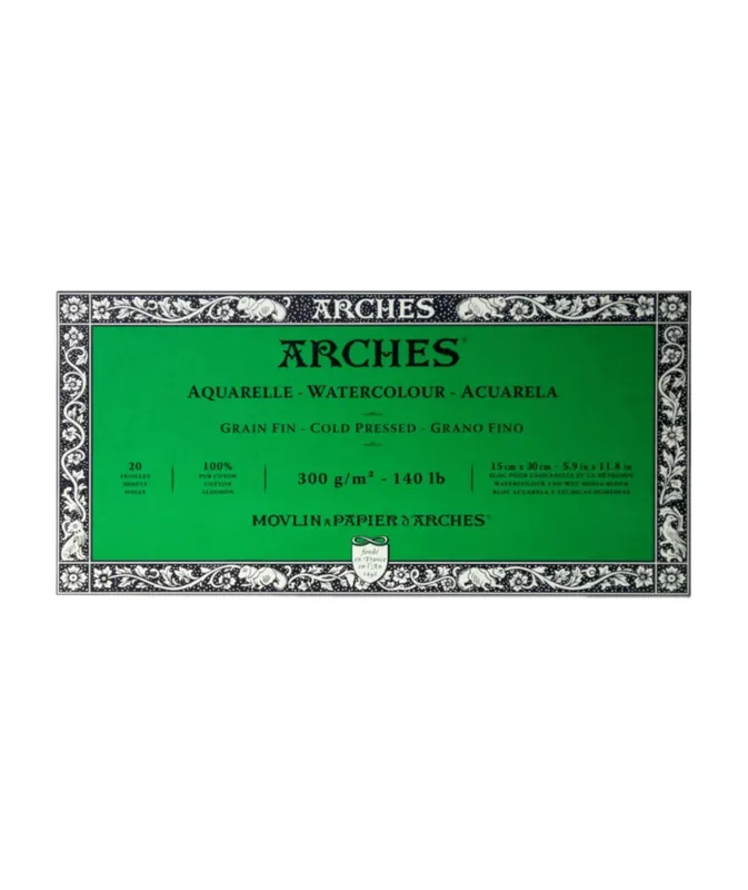 Bloc para acuarela de la marca Arches encolado en los cuatro lados,el bloc clásico de Arches para pintar directamente sin tener que fijar el papel a un tableroConsiderado por muchos acuarelistas y artistas de todo el mundo uno de los mejores papeles de acuarelaTamaño: 30 X 15 cms.Hojas : bloc de 20 hojasGramaje: 300 grs.y grano finoAlgodón: 100% algodónOtras características: sin ácido ni blanqueadores ópticos,con reserva alcalina y con tratamiento antifúngico (antimoho),calidad de conservación óptima.Técnicas: acuarela y técnicas de agua ( tinta,témpera,acrílico,gouache…)