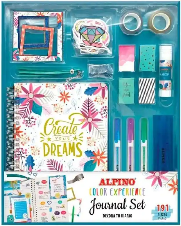 Journal Set Alpino – Todo lo Necesario para Planificar, Decorar y Organizar Tu Agenda o Diario – Incluye 191 PiezasEl Journal Set Alpino es el kit perfecto para quienes desean llevar su planificación y organización al siguiente nivel. Este set completo incluye todo lo necesario para decorar y personalizar tu agenda o diario, permitiendo que cada usuario exprese su creatividad y estilo de una manera unica. Ideal tanto para estudiantes como para adultos, este set se convierte en un aliado imprescindible para mantener el orden y la inspiración.Este Journal Set incluye una amplia gama de 191 piezas, que van desde una libreta de 21,3 x 16,5 cm con 70 hojas, hasta 10 papeles para scrapbook y 90 pegatinas, garantizando que siempre tengas los materiales adecuados para tus proyectos. También incluye 12 pegatinas smile, 6 marcos para fotos y 4 marcadores magnéticos, perfectos para personalizar tu diario y hacerlo verdaderamente tuyo.El set también cuenta con 3 bolígrafos de gel, 2 washi tapes y una barra de pegamento, proporcionando todo lo necesario para realizar decoraciones y anotaciones creativas. Además, incluye 51 pegatinas individuales de 5×5 cm, que son ideales para añadir toques coloridos y divertidos a tus notas y páginas, haciendo que la planificación sea aun más emocionante.Con el Journal Set Alpino, cada página de tu diario se convierte en un lienzo para tu creatividad. Utiliza la regla de 15 cm y los clips con forma de corazón para darle un toque especial a tus proyectos. Este set es perfecto para cualquier persona que quiera disfrutar de la escritura y la organización, haciendo que cada día sea una nueva oportunidad para crear.