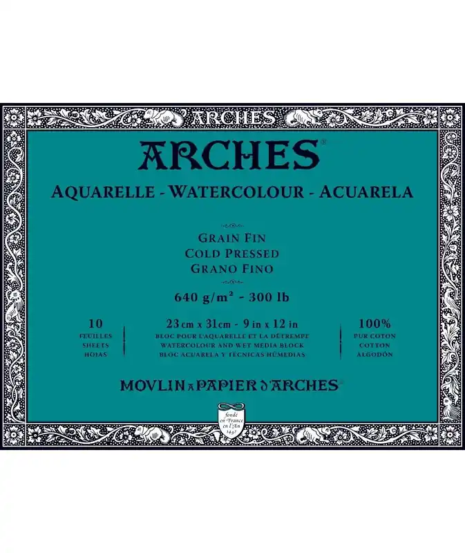 Bloc para acuarela de la marca Arches encolado en los cuatro lados,el bloc clásico de Arches para pintar directamente sin tener que fijar el papel a un tableroConsiderado por muchos acuarelistas y artistas de todo el mundo uno de los mejores papeles de acuarelaGramaje muy alto que hace que prácticamente tenga ya la consistencia de un cartónTamaño: 23 X 31 cms.Hojas : bloc de 10 hojasGramaje: 640 grs.y grano finoAlgodón: 100% algodónOtras características: sin ácido ni blanqueadores ópticos,con reserva alcalina y con tratamiento antifúngico (antimoho),calidad de conservación óptima.Técnicas: acuarela y técnicas de agua ( tinta,témpera,acrílico,gouache…)