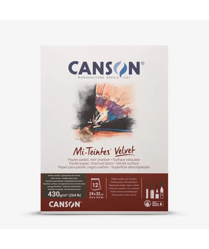 El nuevo bloc para pintar con pastel de la marca Canson Mi-Teintes Velvet.430 grs,se adapta también para técnicas húmedasTamaño: 24 x 32 cms.Color: hojas de color NEGROSuperficie aterciopelada.12 hojas.El papel Mi-Teintes Velvet es ideal para pasteles gracias a su superficie aterciopelada.No ha límites para las capas de colores ya que se pueden superponer y no es necesario el uso de un fijador ya que su textura fibrosa le confiere una excelente fijación del pigmento.Es ideal para trabajar con pasteles muy suaves para un mejor control del empaste y también con lápiz pastel para una mayor precisión.Con Mi-Teintes Velvet se logran áreas de color perfectas y planas con un sólo trazo.A diferencia de las texturas microabrasivas su delicada superficie tiene la ventaja de reducir el consumo de la barra de pastel por lo que duran más.