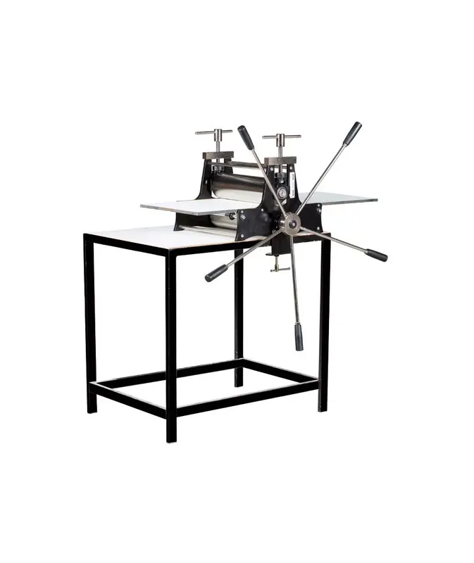 Tórculo de estampación fabricado en acero, cromado y pintado en epoxi.POR ENCARGO PLAZO DE ENTREGA ESTIMADO DOS-TRES SEMANAS laborablesMESA NO INCLUIDA – Diámetro de los cilindros 105 mm, con rodillo inferior moleteado para obtener un mayor arrastre. – Cilindro superior con rodamientos oscilantes. – Capacidad de la pletina 400 de ancho por 1000mm de longitud. – Accionamiento mediante 5 aspas. – Abertura máxima entre cilindros 55 mm. – Incorpora regletas milimetradas para controlar la presión de los cilindros. – Para el óptimo deslizamiento y guiado de la pletina incorpora 4 rulinas giratorias y dos guías laterales de cobre.CONSULTAR GASTOS DE ENVIO SEGUN DIRECCION EN 660798903- Dimensiones del tórculo: – longitud: 517 mm. – anchura: 475 mm. – altura: 405 mm. – Peso aproximado del tórculo: 45 Kg. ACCESORIOS DEL TÓRCULO: – Brida de fijación para mesa (Ref. 130-01) – Pletina fibra rígida ANTIDEFORMACIÓN 408x800x10 mm. – Fieltro de 400x800x3 mm. – Fieltro de 400x800x5 mm. – Embalaje de cartón especial para tórculo