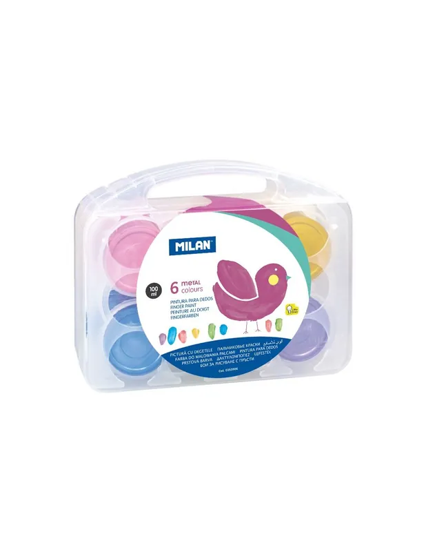 6 tarros de 100 ml de colores metalizados (amarillo, naranja, rosa, lila, azul, verde). Pintura de dedos con una consistencia excelente para trabajar directamente con las manos, ideal para manualidades infantiles. Puede aplicarse con facilidad con los dedos, aunque también puede usarse con un cartoncillo, un pincel o una esponja. También sirve para crear texturas, e imprimir marcas y tampones. Los colores vivos y brillantes se pueden mezclar para crear nuevos tonos. Se lava fácilmente sobre la mayoría de tejidos. El tiempo de secado depende del grosor de pintura.