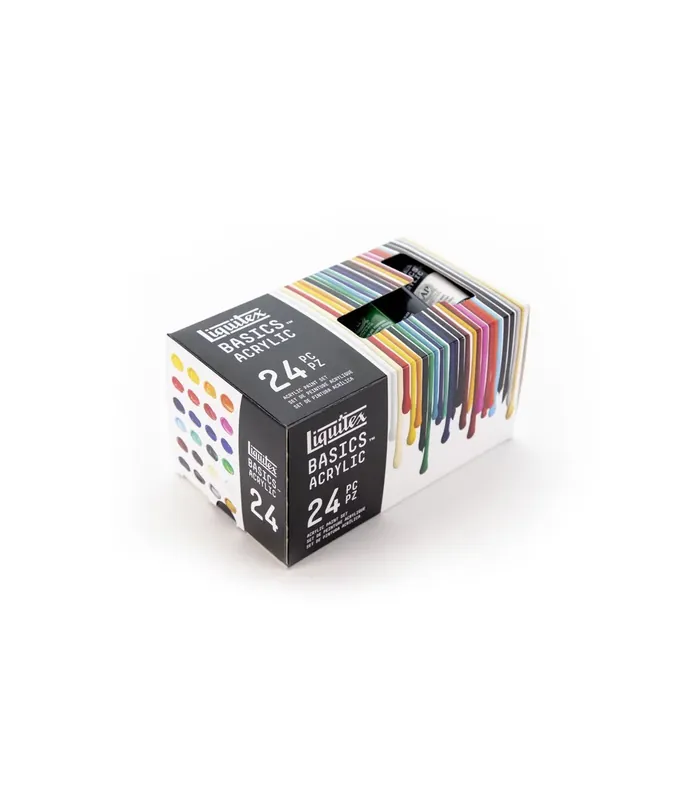 Set con 24 acrílicos Liquitex gama BasicsGama de acrílicos calidad media de la marca Liquitex en estuche de cartónTubos de 22 ml de capacidadFormulada con pigmentos de calidad Bellas ArtesViscosidad mediaResistente al paso del tiempoEquilibrio perfecto entre calidad y precio