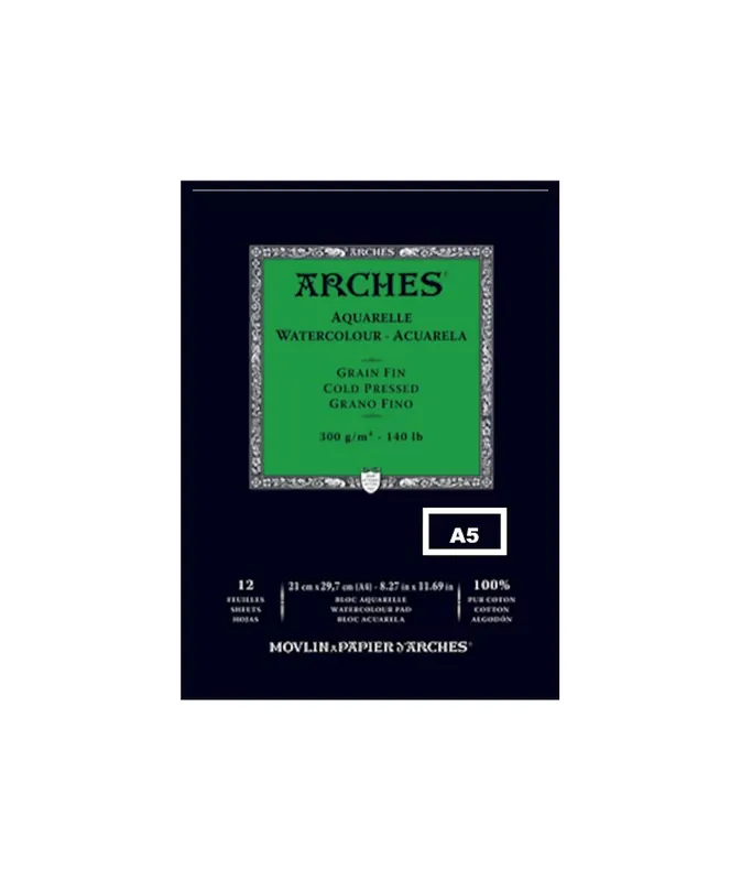 Bloc para acuarela de la marca Arches encolado en el lado corto, una nueva presentación que permite disfrutar de la misma calidad de siempre a un precio muy asequible.El considerado por muchos acuarelistas y artistas de todo el mundo uno de los mejores papeles de acuarelaTamaño: A5 (21 x 14,8 cms.)Hojas : bloc de 12 hojasGramaje: 300 grs.y grano finoAlgodón: 100% algodónOtras características: sin ácido ni blanqueadores ópticos,con reserva alcalina y con tratamiento antifúngico (antimoho),calidad de conservación óptima.Técnicas: acuarela y técnicas de agua ( tinta,témpera,acrílico,gouache…)