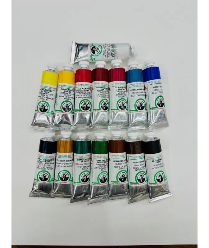 Selección de 15 colores de los más utilizados como colores base para pintura al óleo en sus pigmentos más puros Incluye cadmios y cobaltosTubos de 40 ml.Oleos que se fabrican siguiendo las recetas de los viejos maestros holandeses pero con la tecnología más moderna y teniendo en cuenta las opiniones,sugerencias…de artistas actuales en todo el mundo.Con la mayor proporción posible de pigmento en cada colorLos Old Holland Classic óleos mezclan los mejores colores tradicionales con los pigmentos de mayor resistencia a la luzHechos sólo con pigmentos y aceite de linaza prensado en frío de la primera presiónGama de más de 160 colores uqe incluyen tonos opacos,transparentes y semiPor su alta densidad no se pueden envasar a máquina y se envasan de forma artesanal tubo a tubo.Etiqueta de cada tubo hecha con color real para poder visualizar el color de forma genuina.Los tubos de óleo Old Holland se usan en más de cincuenta paises por artistas de gran nivel como en su tiempo Van Gogh,Vermeer,Hals…Oleos Old Holland del set :Blanco mezclas / Amarillo cadmio limón/ Amarillo cadmio medio / Rojo cadmio medio / alizarin crimson extra / magenta Old Holland /azul cobalto / azul cerúleo / azul Prusia /ocre amarillo oscuro / verde viridian oscuro / verde cinabrio /sombra natural /siena tostada / negro viña.