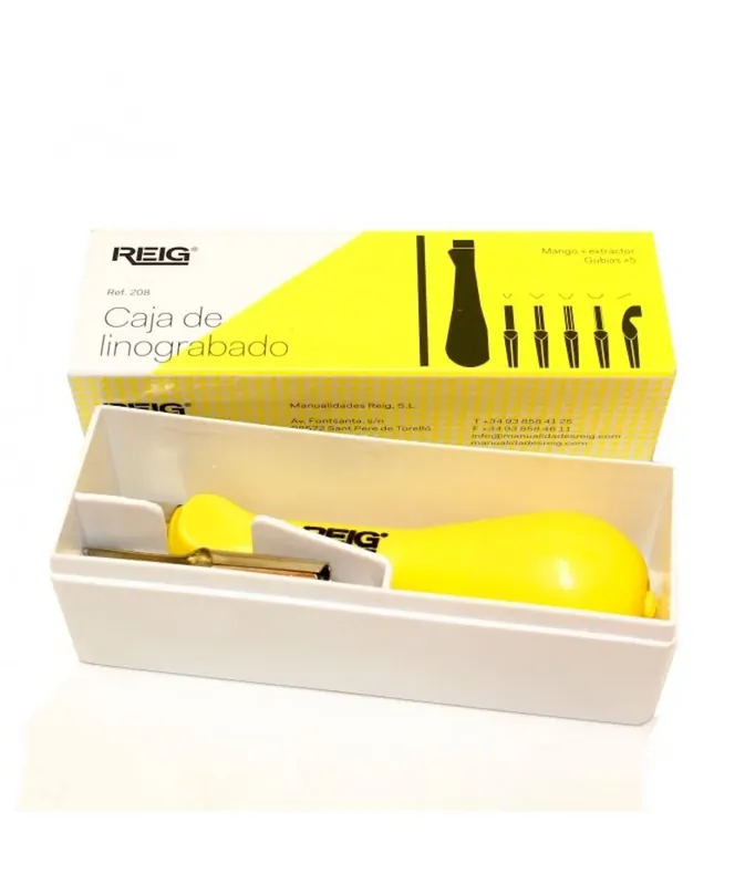 Juego con un mango y cinco puntas para hacer linograbado o madera blanda tipo contrachapado.Caja de linograbado con mango ergonómico y 5 cuchillas.Este set de gubias para linograbado, contiene un mango ergonómico de plástico y un extractor para cambiar las gubias más cinco puntas de gubias intercambiables.Fabricadas en acero de alta calidad, cromadas, afiladas y templadas, para prolongar el corte.Muy usado en colegios e institutos y para iniciarse en el grabado con linóleo,planchas de goma y de vinilo(La estética de la caja puede cambiar según la tirada de fabricación)