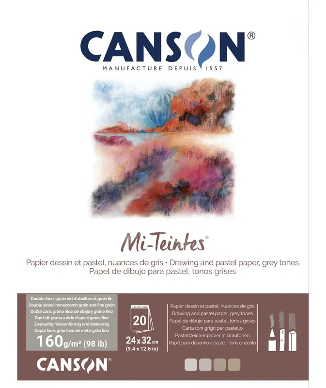 Bloc Canson M-Teintes colores grises Tamaño: A4 aproximadamente (24 x 32 cms.)Hojas : bloc de 20 hojas ,encolado en el lado cortoGramaje: 160 grs.; grano fino en una cara y grano nido de abeja en la otra,puede usarse por ambas carasColor: gama de colores grises (5 hojas de cada tono gris,vienen cuatro tonos en el bloc)Técnicas: técnicas secas como lápiz,carboncillos,pastel,grafito,etc.,también algo de tinta y acuarela ligera así como manualidades (plegado,cortado,creación de tarjetas…).También se puede usar como fondo de dibujos a la hora de enmarcar por su gama de colores neutros y su especial texturaOtras características: es un papel de pulpa teñida que ha ganado un reconocimiento mundial sobre todo en la técnica de pastel.Cumple la normativa ISO 9706 de conservación lo que garantiza una conservación óptima