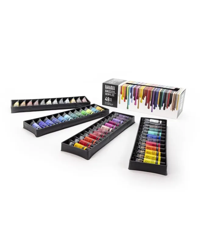 Set con 48 acrílicos Liquitex gama BasicsGama de colores acrílicos calidad media de la marca Liquitex en estuche de cartónTubos de acrílico de 22 ml de capacidadFormulados con pigmentos de calidad Bellas ArtesViscosidad mediaResistente al paso del tiempoEquilibrio perfecto entre calidad y precio