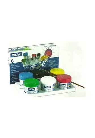 Caja de cartón con 6 témperas de 40 ml de Milán con una paleta de plástico y un pincel.