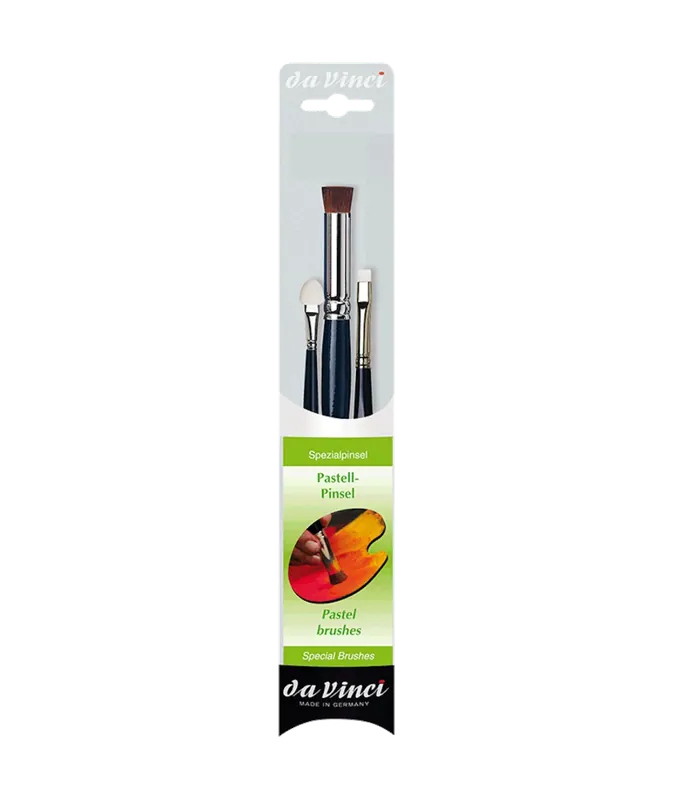 Estuche con pinceles específicos para utilizar con pastel.El juego de pinceles Da Vinci para pastel incluye:-Pincel de pelo de poney extracorto grueso de 1,2 cms. de diámetro-Pincel plano corto de pelo sintético blanco-Aplicador de espuma.Diseñados para usar con carboncillo,pinturas de pastel ,cretas…Permiten difuminar y mezclar