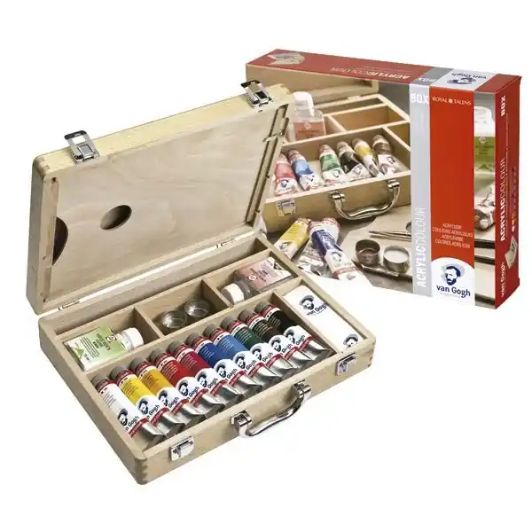 MALETÍN ACRÍLICO VAN GOGH 10×40 MLContenido: 10 tubos de pintura acrílica Van Gogh de 40 ml, 2 frascos de 75 ml auxiliares, pocillo, 2 pinceles y paleta de madera.Colores: Blanco titanio 105 / Amarillo azo claro 268 / Amarillo azo oscuro 270 / Rojo naftol medio 396 / Rosa quinacridona 366 / Azul ultramar 504 / Azul brillante 546 / Verde permanente oscuro 619 / Tierra sombra tostado 409 / Negro óxido 735