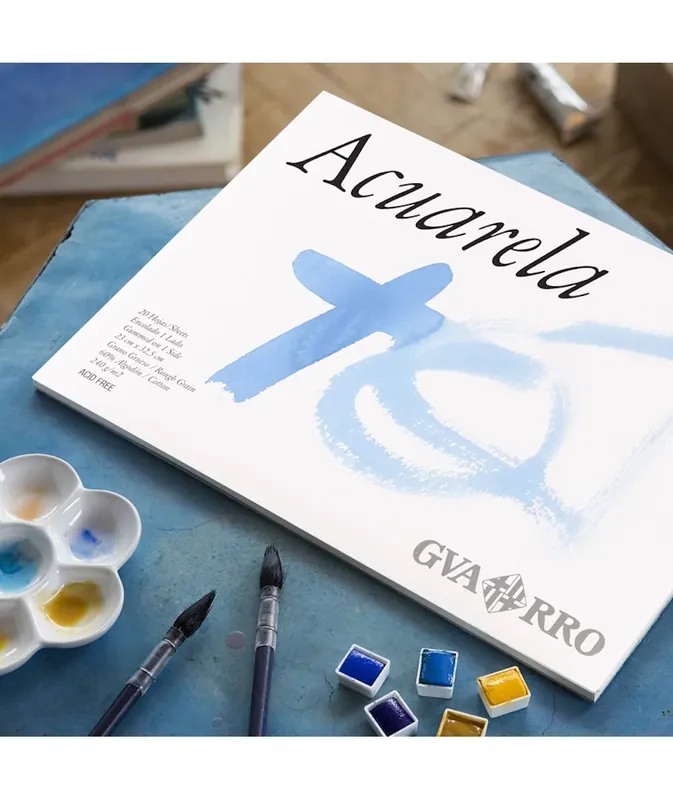 Bloc Guarro acuarela 240 grs en tamaño DIN A4Muy usado para como una calidad media en acuarela por aficionados en academias,escuelas e institutosEs un papel para acuarela blanco con barbas a dos lados y marca de agua.Fabricado en forma redonda posee una excelente calidad y resistencia con un precio ajustadoTamaño: 21 x 29,7 cms (DIN 4 aproximado)Hojas : 20 hojas encoladas en un ladoGramaje: 240 grs. y grano finoAlgodón: alto contenido de algodón( 60%)Otras características: sin ácido,con reserva alcalina y tratamiento antifúngico para garantizar la durabilidad.Fabricado en forma redonda es un papel idóneo para técnicas secas.Su textura verjurada permite un excelente agarre de los materialesTécnicas: sanguina,carboncillo y lápiz,pastel