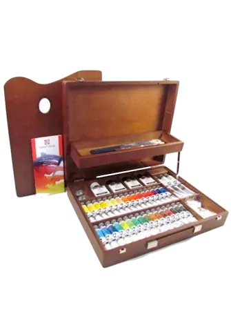 Caja de pintura al óleo de la marca Van Gogh (la línea media de la marca Talens) Hecha en madera de color haya medio con cajón pequeño superior,tiene en su interior:32 tubos de 20 ml óleo en colores surtidos Van Gogh2 blancos de 60 mlTubo de 60 ml de pasta para pintar relieves5 pinceles surtidos y espátulaCarboncillos,Aceitera metálica doble,paño de limpiezaIncluye paleta de madera