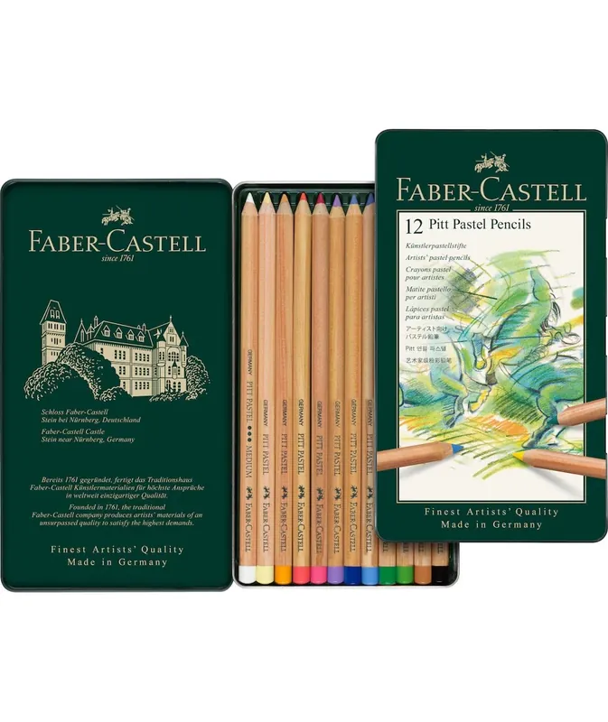 Caja de metal con 12 lápices pastel de la marca Faber CastellColores intensos fáciles de difuminar con el dedo,difumino,tela …Mina de 4,3 mm de diámetro altamente resistente a la roturaColores altamente resistentes a la acción de la luz Disponibles recambios sueltos para reponer o para ampliar la gama (el surtido completo es de 60 colores)