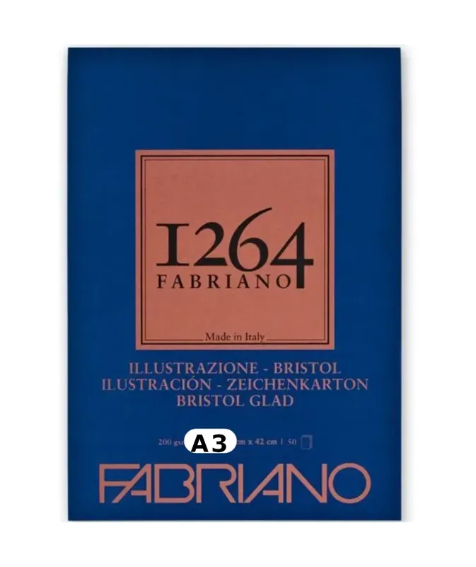 Papel tipo Bristol de la marca italiana Fabriano en calidad estudio.El bloc Ilustración Fabriano 1264 tiene un papel extra blanco y extra liso, lo que permite realizar trabajos finos y de detalle así como nos proporciona contrastes excepcionales.Tamaño: A3 (42 x 29,7 cms.)Hojas : bloc de 50 hojas,microperforado para facilitar el arranque de las hojas.Gramaje: 200 grs.,grano suave satinado,100% alfacelulosaOtras características: sin ácido.Técnicas: es adecuado para todas las técnicas secas, desde esbozos a dibujos con lápices de color y técnicas húmedas, pluma,tinta,gouache y acuarela.
