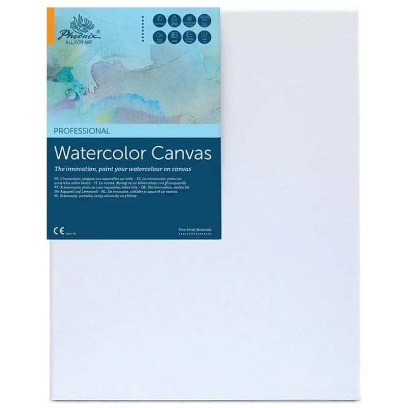 BASTIDOR ENTELADO PARA ACUARELAWatercolour Canvas, el lienzo de los acuarelistas. Algodón 100%, gramaje 250 gr/m2, libre de ácido, madera de pino.Bastidor entelado para acuarela en lienzo de algodón con triple capa de imprimación universal Phoenix Arts de gesso blanco. Ofrece un resultado óptimo en adherencia, en movimiento del trazo, aguados y en luminosidad final del color.Nuestro bastidor entelado para acuarela, Watercolour Canvas, ofrece un nuevo horizonte a los artistas acuarelistas, proporcionando un soporte resistente y duradero que permite reemplazar al papel tradicional, trabajando de la forma más tradicional sobre caballete. Descubre cómo este bastidor entelado eleva tu técnica y te permite explorar nuevos caminos creativos en el arte de la acuarela.Su grano extrafino, permite trabajar con mucha precisión y delicadeza los detalles de tu obra.Especialmente indicado para la pintura a la acuarela, a este bastidor es ideal para aplicar cualquier técnica de pintura, como el óleo, trabajos en acrílico, guache y manualidades.El Watercolour Canvas es un bastidor muy novedoso y versátil. ¡Pruébalo!Modo de empleo: En las técnicas humedas es necesario humedecer la tela con un pincel 24 horas antes del primer uso. Siguiendo esta indicación, los resultados obtenidos son excelentes.