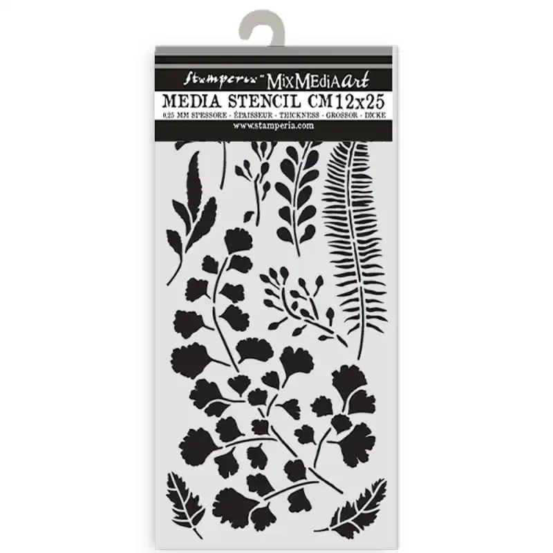 Stencil Stamperia Mix Media Art 25 x 12 cm. – Herbarium Silvae LeavesIdeal para todos los proyectos, especialmente para Mix Media por su grosor de 0.5 mm.Las máscaras son elementos muy versátiles y que dan mucho juego, tanto en el mundo del scrapbooking como en el del Mixed Media. Con ellas puedes hacer un montón de cosas: crearte tus propios fondos, tus propios adornos, texturas… Puedes usarlas con tintas en spray, con tintas Distress y sus aplicadores, estarcido con purpurina, pigmentos o Perfect Pearls, aplicarles gesso o pasta de relieve… ¡Cuando empieces a cogerles el gusto no sabrás vivir sin ellas!
