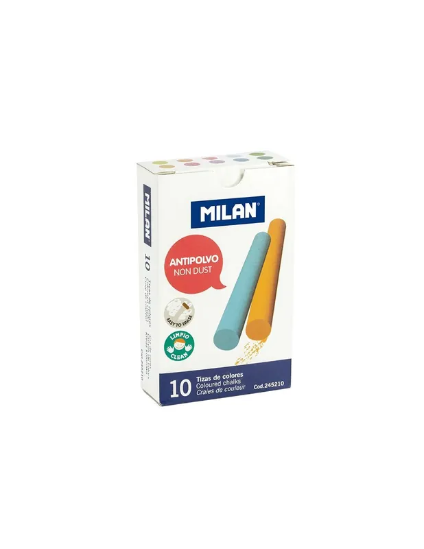 Tizas redondas de colores. Al escribir generan polvo seco de carbonato de calcio, fácil de limpiar. Ideales para uso escolar. Hechas de carbonato de calcio, no contienen caseína ni yeso. 10 colores distintos. Medidas tiza: 1 cm Ø x 8 cm.