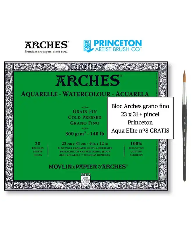 Bloc para acuarela de la marca Arches encolado en los cuatro lados más pincel Princeton sintético Aqua Elite redondo tamaño medio Una gran combinación de bloc y pincel para acuarela gratis (nº 8 redondo)Tamaño: 23 X 31 cms.Hojas : bloc de 20 hojasGramaje: 300 grs.y grano finoAlgodón: 100% algodónOtras características: sin ácido ni blanqueadores ópticos,con reserva alcalina y con tratamiento antifúngico (antimoho),calidad de conservación óptima.Técnicas: acuarela y técnicas de agua ( tinta,témpera,acrílico,gouache…)