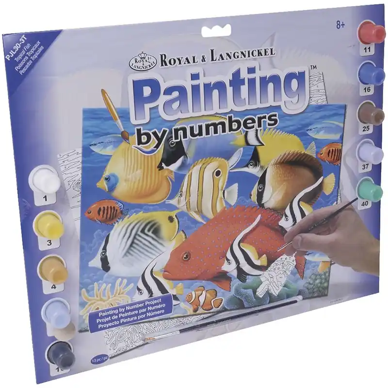 PINTAR POR NÚMEROS ACRÍLICO R&L PECES TROPICALESKit de pintar por numeros con todo lo que necesitas para comenzar de inmediato.Contiene soporte de cartón numerado de 388 x 286 mm, 10 botes de pintura acrílica de 3 ml y un pincel. La pintura acrílica proporciona una buena cobertura en el tablero que está impreso con el diseño que está codificado con numeros para guiarte donde aplicar los colores apropiados.