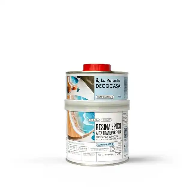 Resina Epoxi Alta Transparencia- Consigue un efecto 3D.- Elevada dureza y brillo.- Aplicación en capas finas.- Ideal para muebles, objetos, suelos así como obras de arte o manualidades.- Superficies perfectamente niveladas y libres de burbujas.- Acabado resistente, pero flexible; no se rompe por impactos.Resina incolora de dos componentes (A y B) que consigue un acabado efecto vidrio de alta durabilidad. Gracias a su alta transparencia, esta resina se puede trabajar por capas sobre cualquier tipo de mueble u objeto. Soporta la humedad y no amarillea.Proporción de mezcla: 100 gr – 40 grFicha técnica:Color: IncoloroRendimiento: 0,5Secado total: 48 horasSecado al tacto: 8hMétodos de aplicación: Brocha, Pincel, Vertido directamente del envase donde se ha realizado la mezclaDiluyente: DisolventeTipo de producto: Técnicas especialesAcabado: Brillante