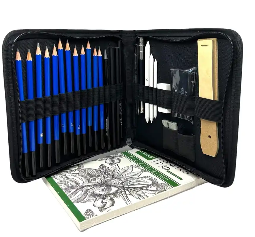 Set muy completo dibujo al grafito y carboncillo, ideal para la iniciación al dibujo.Contenido:12 lápices de grafito, del 4H al 8B3 lápices de carboncillo, blando, medio y duro3 barras de carboncillo, blando, medio y duro3 difuminos1 barra grafito puroSacapuntasGoma vinílicaGoma maleableExtensor de lápices dobleCutterAfilador de papel de lija1 Bloc de esbozo 60 hojas A5Estuche con cremallera