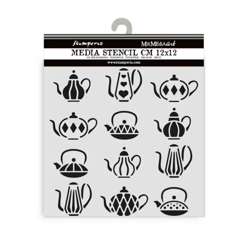 Stamperia Alice in Christmas Tea Pots. Stencil Mix Media Art 12 x 12 cm.Ideal para todos los proyectos, especialmente para Mix Media por su grosor de 0.5 mm.Las máscaras son elementos muy versátiles y que dan mucho juego, tanto en el mundo del scrapbooking como en el del Mixed Media. Con ellas puedes hacer un montón de cosas: crearte tus propios fondos, tus propios adornos, texturas… Puedes usarlas con tintas en spray, con tintas Distress y sus aplicadores, estarcido con purpurina, pigmentos o Perfect Pearls, aplicarles gesso o pasta de relieve… ¡Cuando empieces a cogerles el gusto no sabrás vivir sin ellas!